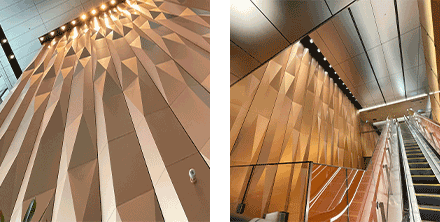 アルポリック/fr Premium Aluminum シリーズは、面材アルミ素地が有する金属感を最大限いかした特殊塗装品で、屋内外の建築空間に角度や光によって美しく変化する要素を付与できます。